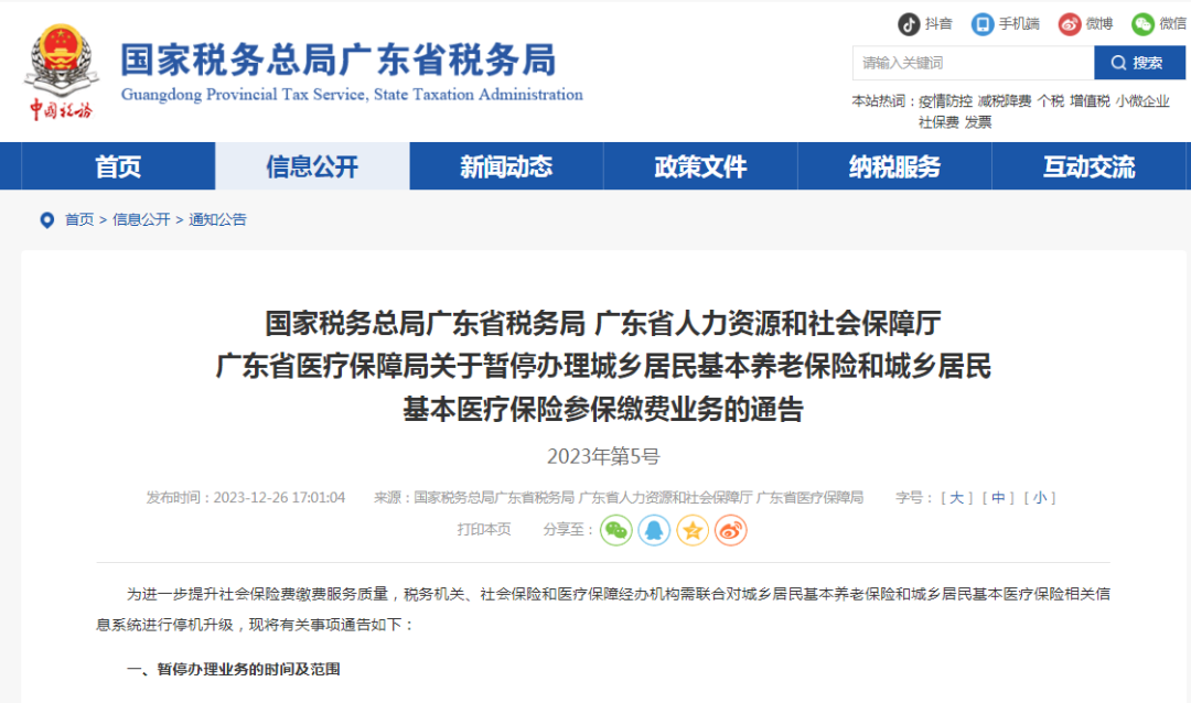 據(jù)國(guó)家稅務(wù)總局廣東省稅務(wù)局網(wǎng)站消息,國(guó)家稅務(wù)總局廣東省稅務(wù)局、廣東省人力資源和社會(huì)保障廳、廣東省醫(yī)療保障局發(fā)布《關(guān)于暫停辦理城鄉(xiāng)居民基本養(yǎng)老保險(xiǎn)和城鄉(xiāng)居民基本醫(yī)療保險(xiǎn)參保繳費(fèi)業(yè)務(wù)的通告》(以下簡(jiǎn)稱《通告》)。
