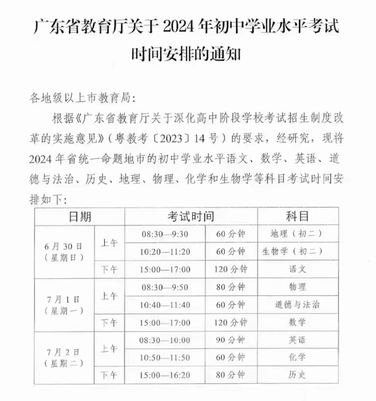 《關(guān)于2024年初中學(xué)業(yè)水平考試時(shí)間