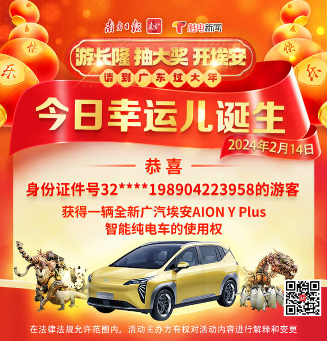 好人啟好運,最暖是廣東。2月14日19時許,由南方+、觸電新聞主辦的“請到廣東過大年之游長隆、抽大獎、開埃安”活動繼續(xù)傳遞好運,開出第六個大獎。隨著“中國好人”朱化學按下開獎鍵,身份證號“32****198904223958”鎖定在大屏幕,江蘇游客吳先生將獲得一輛全新廣汽埃安AION Y Plus智能純電車的使用權(quán)。