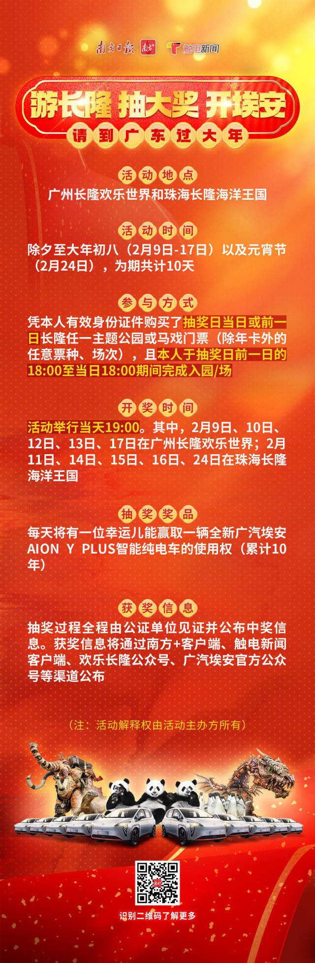 好人啟好運,最暖是廣東。2月16日,大年初七,由南方+、觸電新聞主辦的“請到廣東過大年之游長隆、抽大獎、開埃安”活動開出第八個大獎。隨著“廣東好人”趙曉燕按下開獎鍵,身份證號為“44****19780825786X”的廣東游客成為今日的幸運兒。她將獲得一輛全新廣汽埃安AION Y Plus智能純電車的使用權。