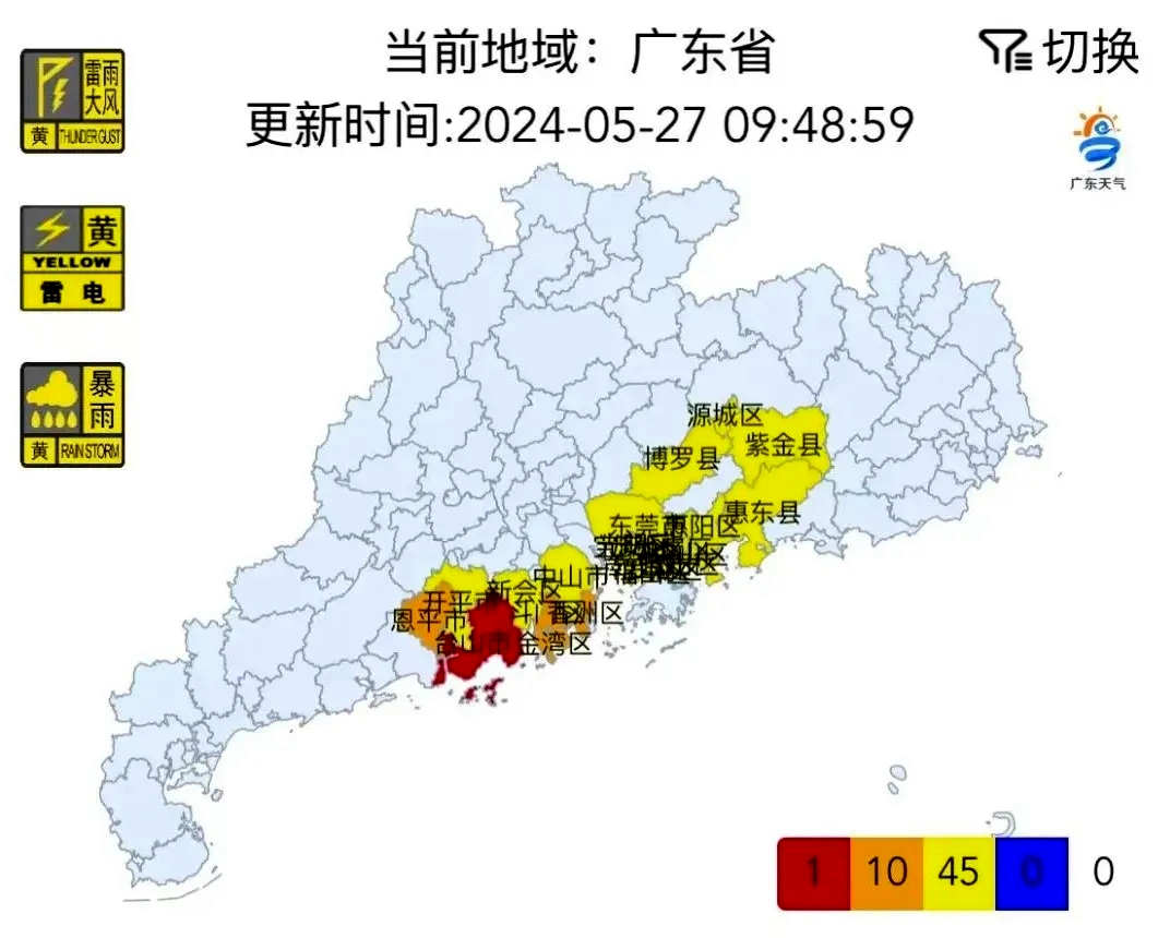 29日,粵西和珠江口西側(cè)市縣有大雨局部暴雨,其余市縣有陣雨局部大雨。