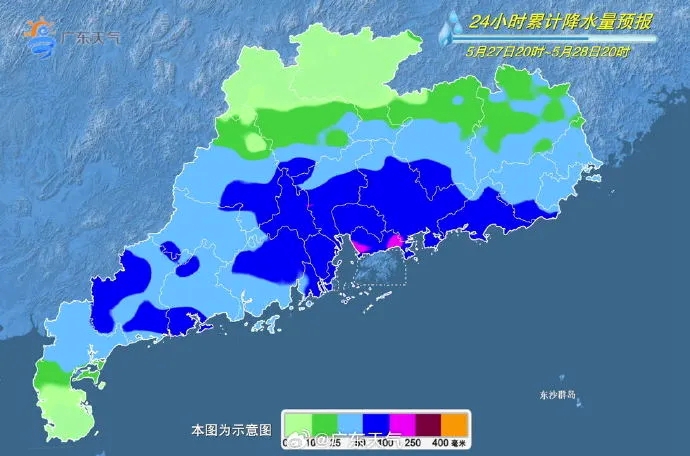 27日-28日,粵北、珠江三角洲、粵西的北部和粵東市縣先后有暴雨,部分市縣有大暴雨局部特大暴雨,其余市縣雷陣雨轉(zhuǎn)大雨局部暴雨。