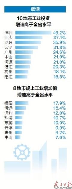 具體到各地市,深圳(49.2%)、汕頭(37.1%)、茂名(35.9%)、云。31.8%)、廣州(24.6%)、中山(21.0%)、河源(21.0%)、湛江(20.3%)、梅州(18.1%)、陽江(16.5%)10個地市的工業投資增速均高于全省水平。