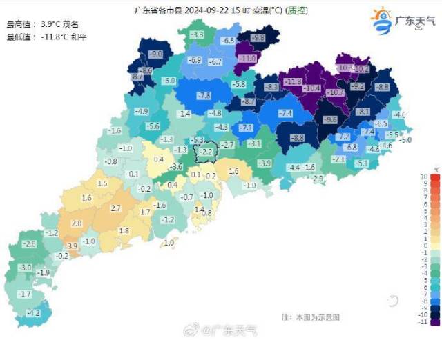 受冷空氣和降雨影響,截至22日15時,粵北、珠三角、粵東地區氣溫普遍低于30℃,氣溫最低的和平錄得21.9℃,同比21日15時下降11.8℃。