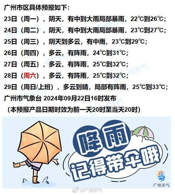 @廣州天氣預計,未來一周,雨水是主角,“阿冷”來客串。25日起,副熱帶高壓加強,廣州降雨減弱氣溫回升,26日起,廣州市區日最高氣溫有望重新突破30℃。大家出門還是隨身帶傘,及時關注最新預報。