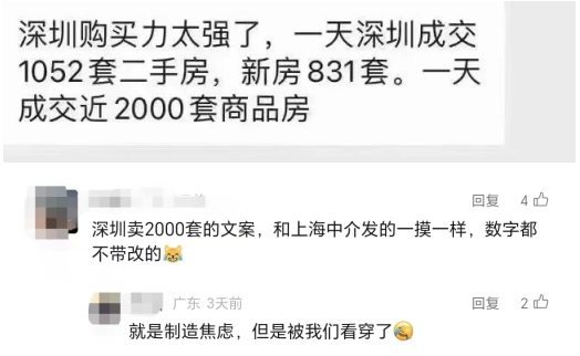 對于深圳新房二手房單日成交近2000套的說法,有網友留言稱,深圳一天賣2000套房的文案和上海中介發的一模一樣,連數字都沒改。