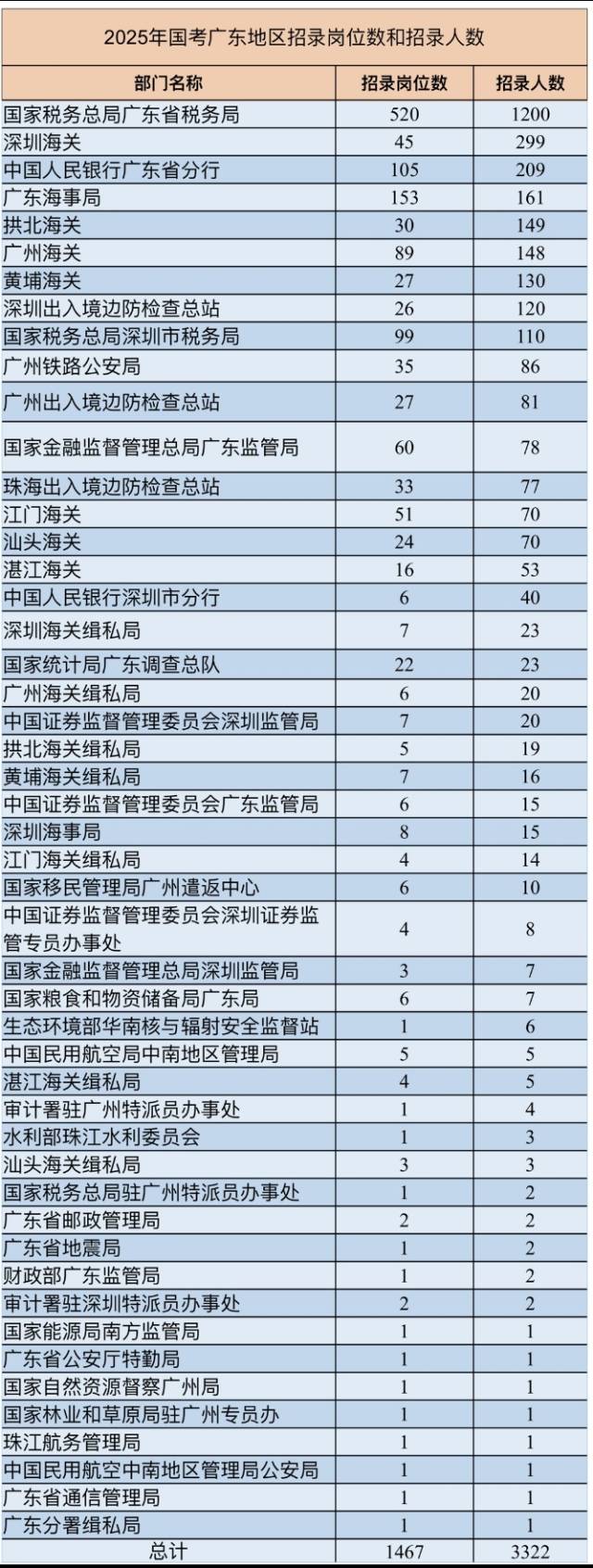 據統計,廣東地區有1467個崗位參加招考,招錄人數為3322人。其中,國家稅務總局廣東省稅務局招錄崗位和人數最多,分別為520個、1200人。