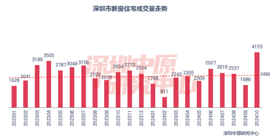 據深圳中原研究中心統計,今年10月,深圳全市一手住宅網簽4153套,環比上升146.3%,創35個月新高,也是自2021年12月之后首次突破4000套,成交面積40.8萬㎡,環比上升137.3%。