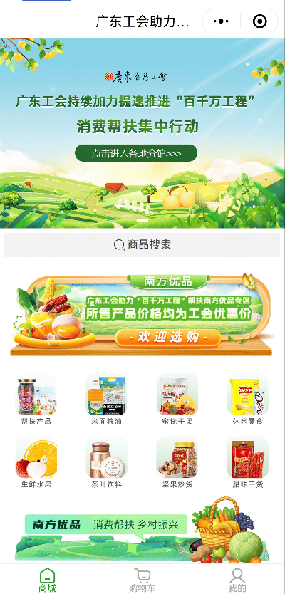目前,廣東工會助力“百千萬工程”幫扶平臺推出三大平臺(專區),共同為消費者提供優質的農產品,同時也為“百千萬工程”的推進貢獻力量。它們分別是廣東工會助力“百千萬工程”幫扶平臺、廣東工會助力“百千萬工程”幫扶南方優品專區、廣東工會助力“百千萬工程”幫扶南粵分享匯專區 ,均可通過“微信小程序”搜索相應名稱進入《廣東工會持續加力提速推進“百千萬工程”消費幫扶集中行動》活動專題。