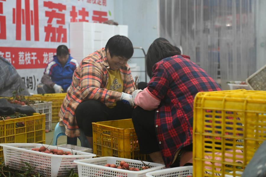 6月18日,果農(nóng)在廣東茂名高州的一個冷庫中打包荔枝。新華社記者 肖恩楠 攝