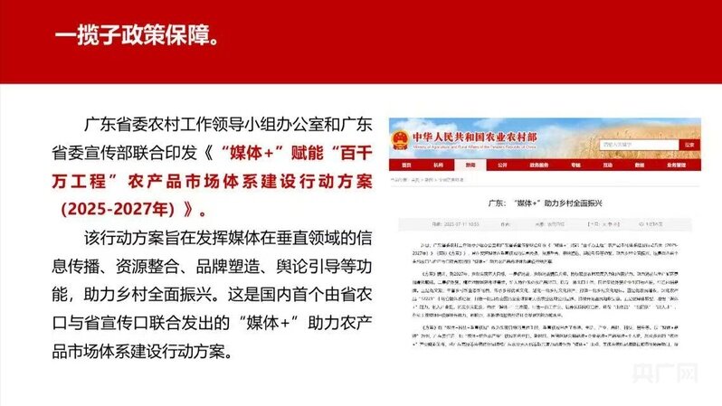 主題發言中,張璐介紹了廣東在全國首個推出的“媒體+”系統性、常態化工作機制——《“媒體+”賦能“百千萬工程”農產品市場體系建設行動方案(2025—2027年)》。這個行動方案旨在指導媒體在農產品市場營銷、品牌建設領域發揮公信力及智庫、傳播、創意等功能,助力鄉村全面振興。