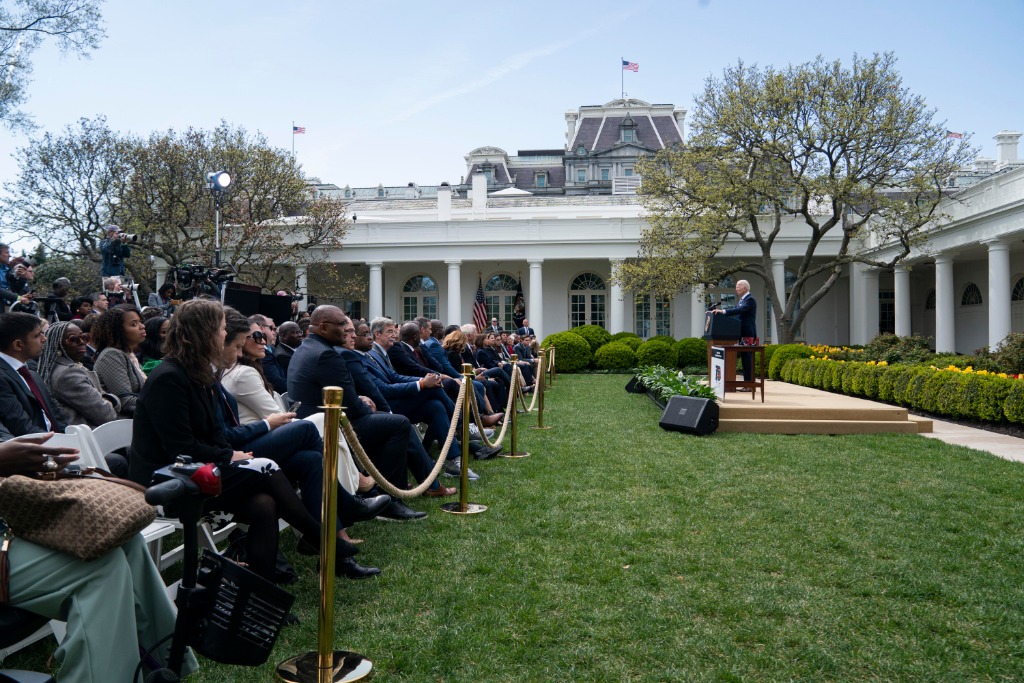 2022年4月11日,美國總統拜登(右一)在華盛頓白宮就監管“幽靈槍”的新規發表講話。新華社記者劉杰攝