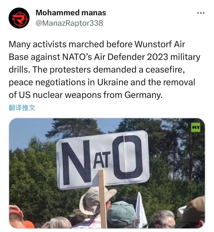 北約正在德國(guó)等地舉行成立以來規(guī)模最大的空中軍事演習(xí),為期長(zhǎng)達(dá)11天,25個(gè)國(guó)家約1萬名軍人和250架各型軍機(jī)參加。接連三天,德國(guó)多地舉行抗議活動(dòng),批評(píng)以美國(guó)為首的北約通過輸出軍援、大規(guī)模軍演來持續(xù)“拱火”俄烏沖突。