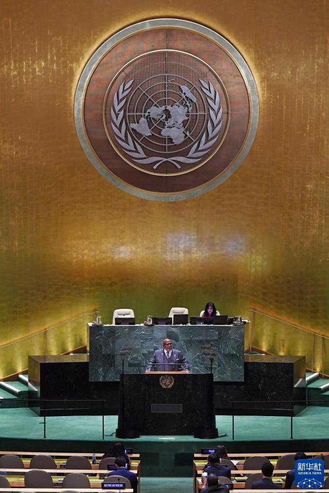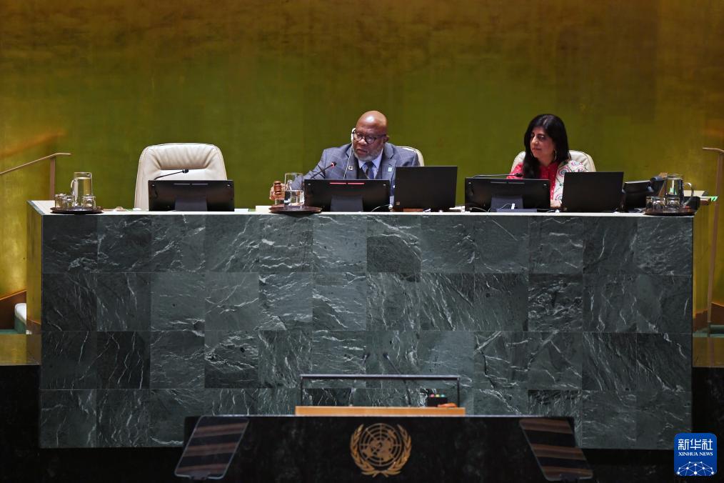 9月26日,在位于紐約的聯合國總部,第78屆聯大主席弗朗西斯(中)發(fā)表聯合國大會一般性辯論閉幕講話。 新華社記者李睿攝