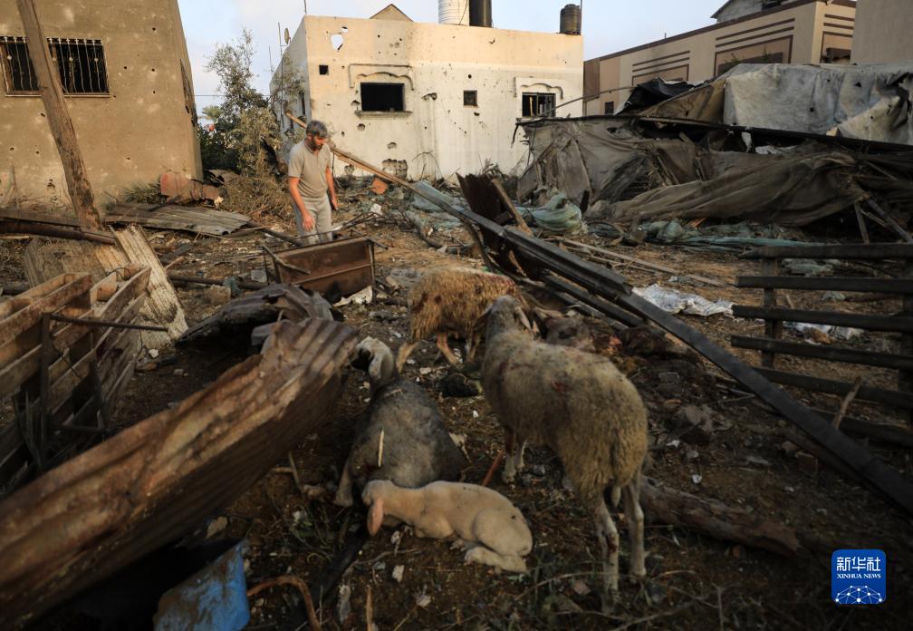 10月23日,一名男子在加沙地帶南部城市汗尤尼斯查看空襲后的建筑廢墟。新華社發(亞西爾·庫迪攝)