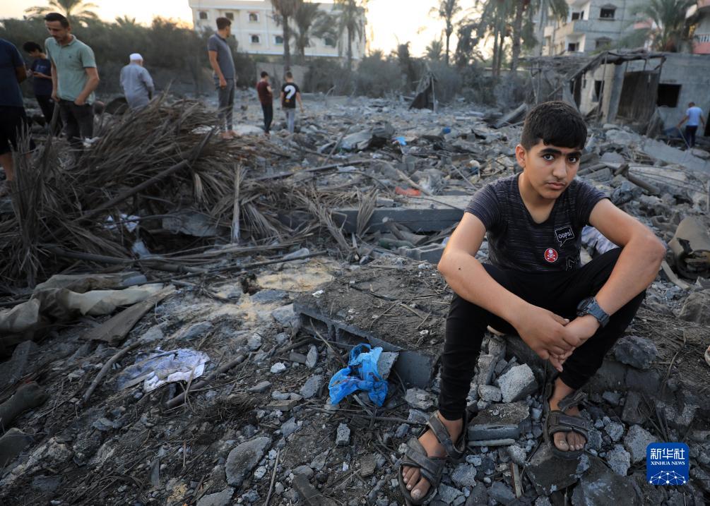10月23日,在加沙地帶南部城市汗尤尼斯,一名男孩坐在遭以色列空襲后的建筑廢墟上。新華社發(亞西爾·庫迪攝)