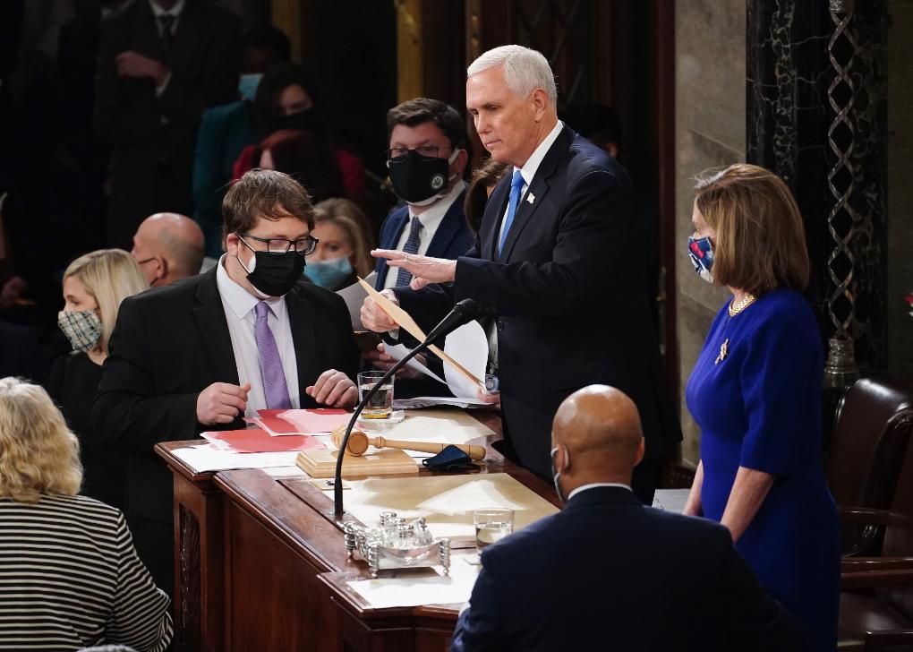 2021年1月6日,在美國華盛頓國會大廈,時任美國副總統彭斯(中)和國會眾議院議長佩洛西(右)出席國會聯席會議。新華社發(Pool圖片,凱文·迪奇攝)