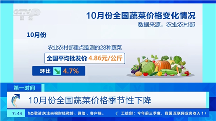 農業農村部農產品市場分析預警團隊蔬菜首席分析師 張晶:蔬菜價格進入季節性下行通道,主要原因一是進入10月份以來,蔬菜主產地逐步南移,北菜南運跨區調運規模有所減少,在途的損耗下降,運輸成本降低;二是耐儲品類存量充足,且夏秋供應模式轉換比較順暢,10月份全國氣溫明顯高于往年同期,有利于秋菜生長。