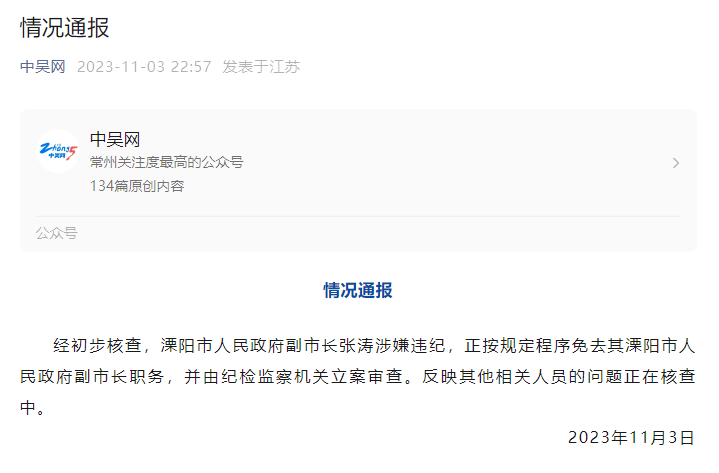 11月3日晚,江蘇常州廣播電視臺微信公眾號“中吳網”發布了情況通報: