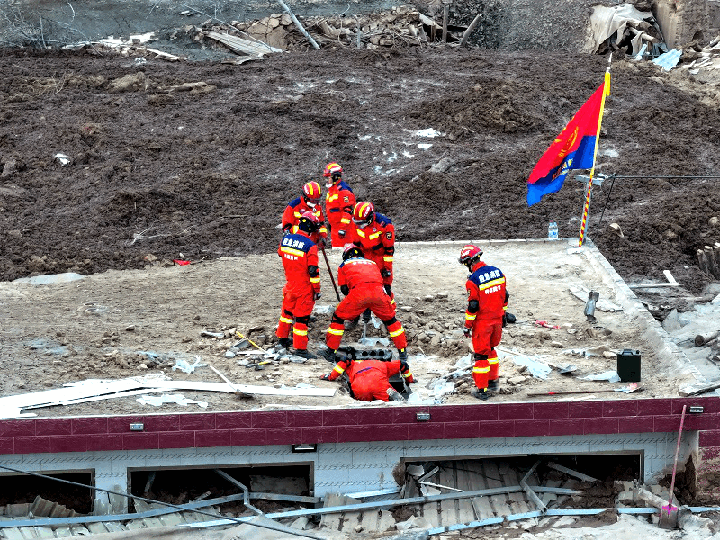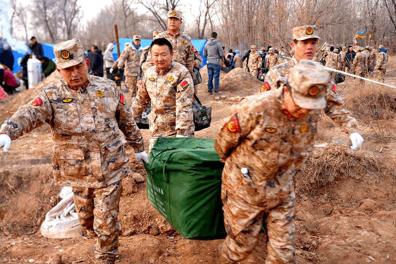 金田村,這個黃河邊不知名的小村子,今天吸引了眾多關注。一隊隊消防應急救援人員和穿著軍大衣的民兵跑步進出,或雙人抬擔架,或手拿肩扛救援物資。一處已被掩埋到只剩下房頂的平臺上,傳出了救援人員的聲音:“從這‘下手’!”七、八個救援人員圍了過來,破拆器“咚咚”啟動聲傳出來。他們所處位置的下方,剛剛探測出有被困人員。