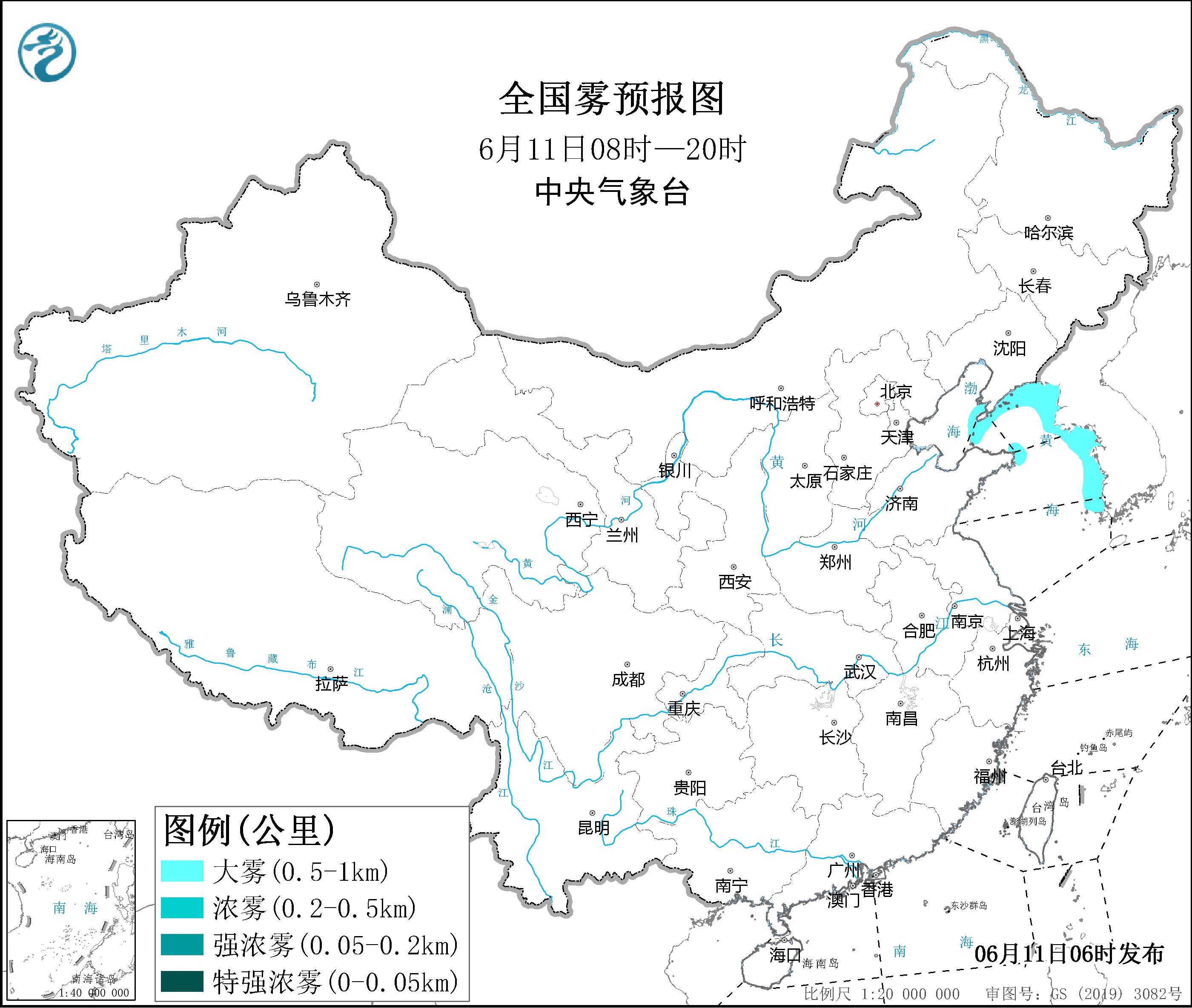 預計,6月11日白天,渤海海峽、黃海北部及中東部部分海域、遼東半島沿岸海域、成山頭附近海域將有能見度不足1公里的大霧。