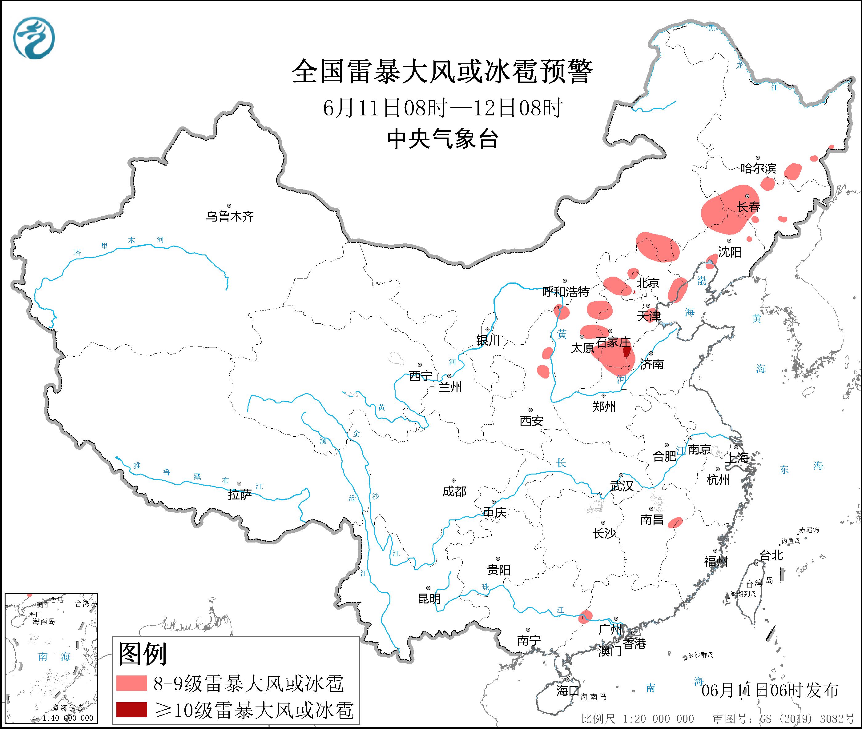 預計6月11日8時至12日8時,內蒙古東南部、黑龍江東南部、吉林中部、遼寧北部、陜西北部、山西中北部、河北西部和南部、北京西部、天津南部等地的部分地區將有8級以上雷暴大風或冰雹天氣,其中,河北南部的部分地區將有10級以上雷暴大風,最大風力可達11級以上;黑龍江東南部、吉林中部、遼寧北部、天津南部、湖南南部、江西中部、浙江中南部、福建東部和西北部、四川南部、貴州中西部和南部、云南東部和西南部、廣西東部和西北部、廣東中東部和西北部、海南島東北部等地的部分地區將有小時雨量大于20毫米的短時強降水天氣,其中,福建西北部部分地區將有小時雨量大于50毫米,最大可達70毫米以上。