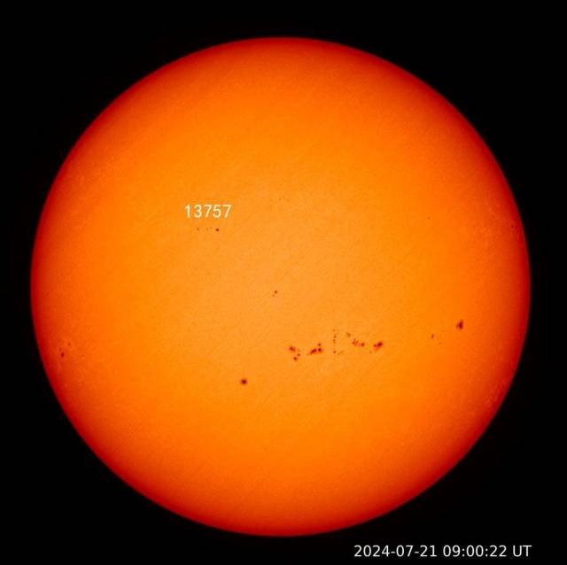據國家空間天氣監測預警中心消息,北京時間7月22日00時40分左右,太陽活動區13757爆發了一次較為明顯的日冕物質拋射(CME)過程,活動爆發位置靠近太陽可見日面中心區域,相對地球方向較正。受其影響,預計在7月24日至25日地球可能出現地磁暴過程。根據可能發生的地磁暴強度來預判,我國可能出現極光活動,但是強度比較弱。