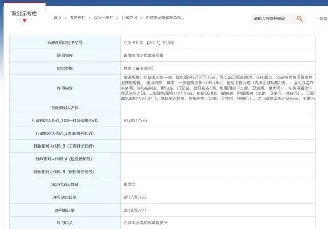 記者注意到,在當地政府官方網站上,有關于該項目建設行政許可相關材料:白發改環字【2017】130號顯示:白城市滑冰館建設項目的許可單位為白城市發展和改革委員會,許可決定日期為2017年05月08日,建設規模為:新建滑冰館一座,建筑面積為7077.16㎡,可以滿足短道速滑、花樣滑冰、冰壺等體育項目室內比賽的需要。