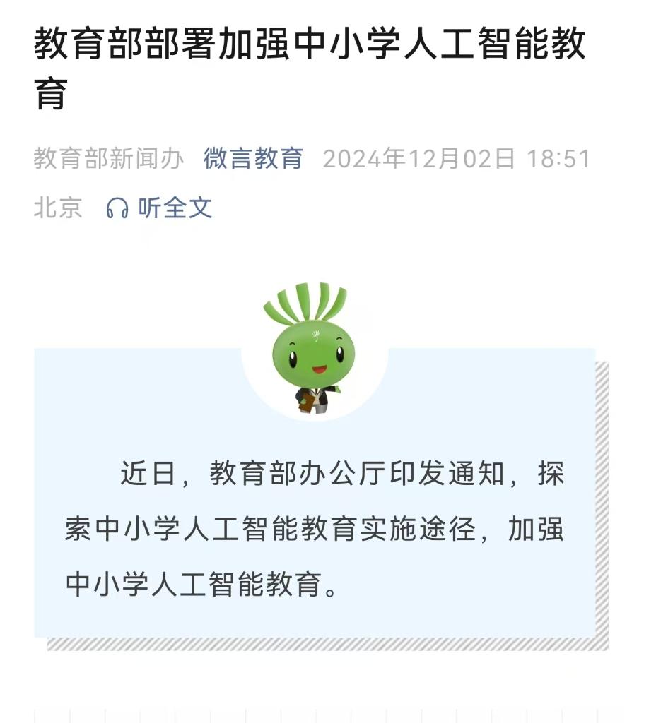 記者12月2日從教育部獲悉,教育部辦公廳近日印發(fā)通知,探索中小學(xué)人工智能教育實施途徑,加強(qiáng)中小學(xué)人工智能教育。