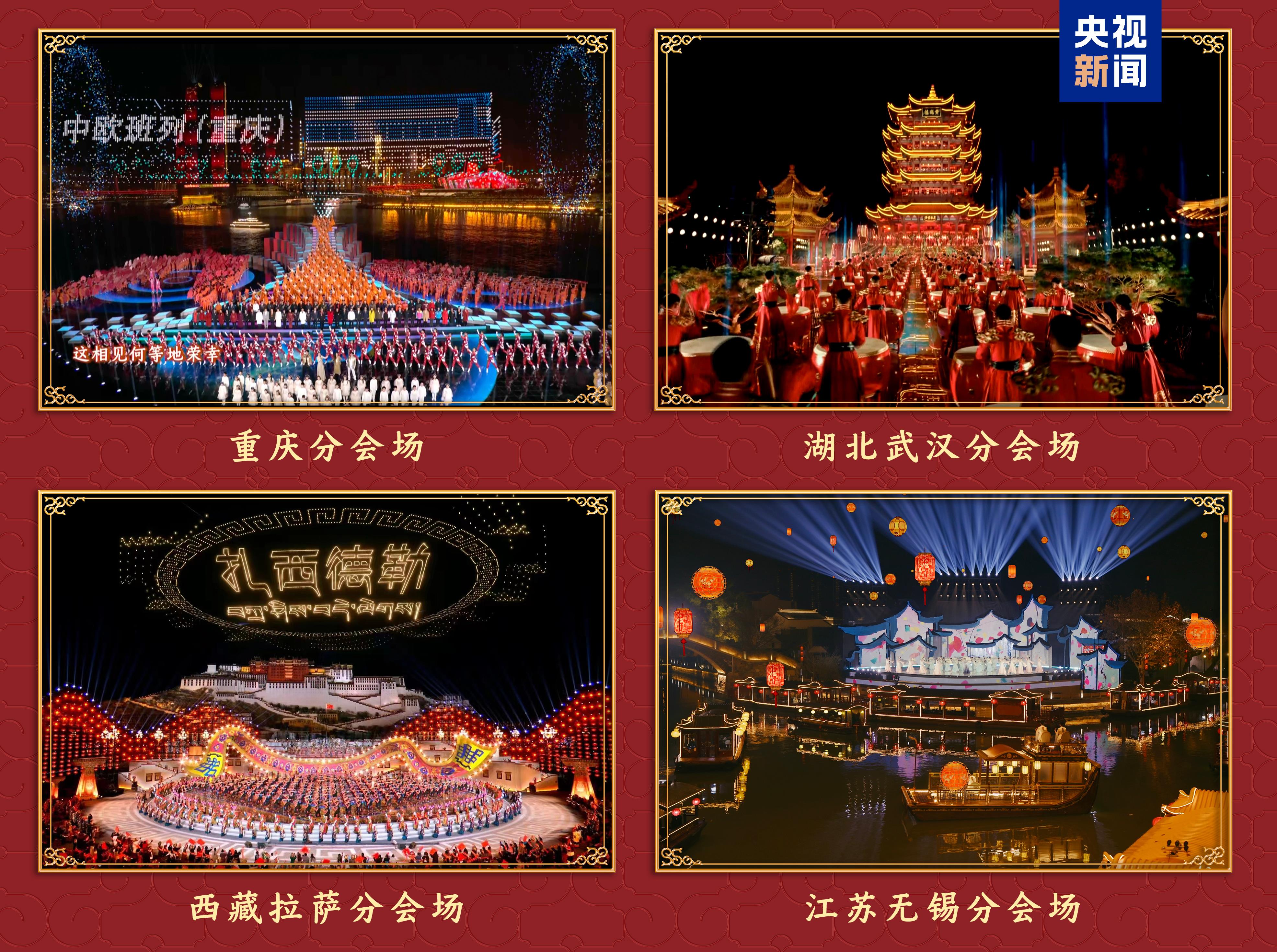 重慶、湖北武漢、西藏拉薩、江蘇無錫四地分會場遙相呼應,一幅幅獨具城市魅力的畫卷,勾勒出祖國山河的壯麗圖景。重慶分會場以“慶·新春”為主題,千廝門大橋的“新春新潮夜”情景音樂秀、780輛新能源汽車智控燈陣和3000架無人機編組的光影聯動,展現山城8D立體的無限魅力。湖北武漢分會場《星漢耀江城》煙火氣濃郁、人情味滿滿,新派戲曲將京、楚、漢三劇種融匯編創,雜技與傳統楚樂創意呈現,鳳凰圖騰振翅欲飛,“英雄城市”深厚的文化底蘊和大江大湖的豪爽之氣一覽無遺。西藏拉薩分會場千人鼓潮融匯熱巴舞、卓舞等西藏傳統舞蹈,才旦卓瑪領銜唱出中華民族一家親的團圓景象;現場還為定日縣送去誠摯祝福,表達出人民至上、風雨同舟、重建美麗新家園的堅定信心;那曲薩普雪山、昌都來古冰川等自然風光遼闊壯美,令人神往。江蘇無錫分會場在江南水鄉上演一場穿越古今的《無錫景·家國情》,曲水穿城而過,評彈曲調婉轉流長,文人墨客揮毫潑墨,千年運河之上千帆競發,在源遠流長的文化與磅礴的工業力量中展現“太湖明珠”的豐沛迷人。