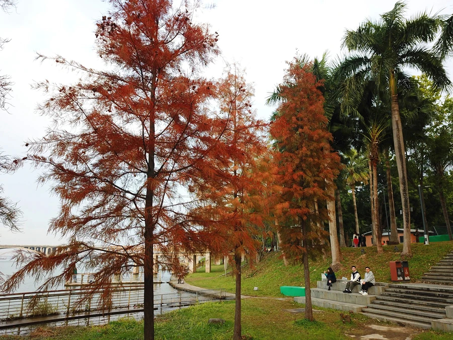 近日,市區東江沙公園一片紅杉林漸成佳境,臨江的一側居然藏著10多株艷麗的紅杉樹。遠遠地就看見江邊一抹亮紅,一棵棵紅杉樹特別顯眼,淺紅、深紅、金紅等多種顏色交織在一起,倒映在東江的湖面,成為一道獨特的風景線,恍如進入油畫世界,吸引了眾多市民來打卡拍照。