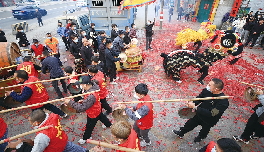 “接燈”的隊伍敲著鑼鼓,舞著獅子,放著鞭炮。