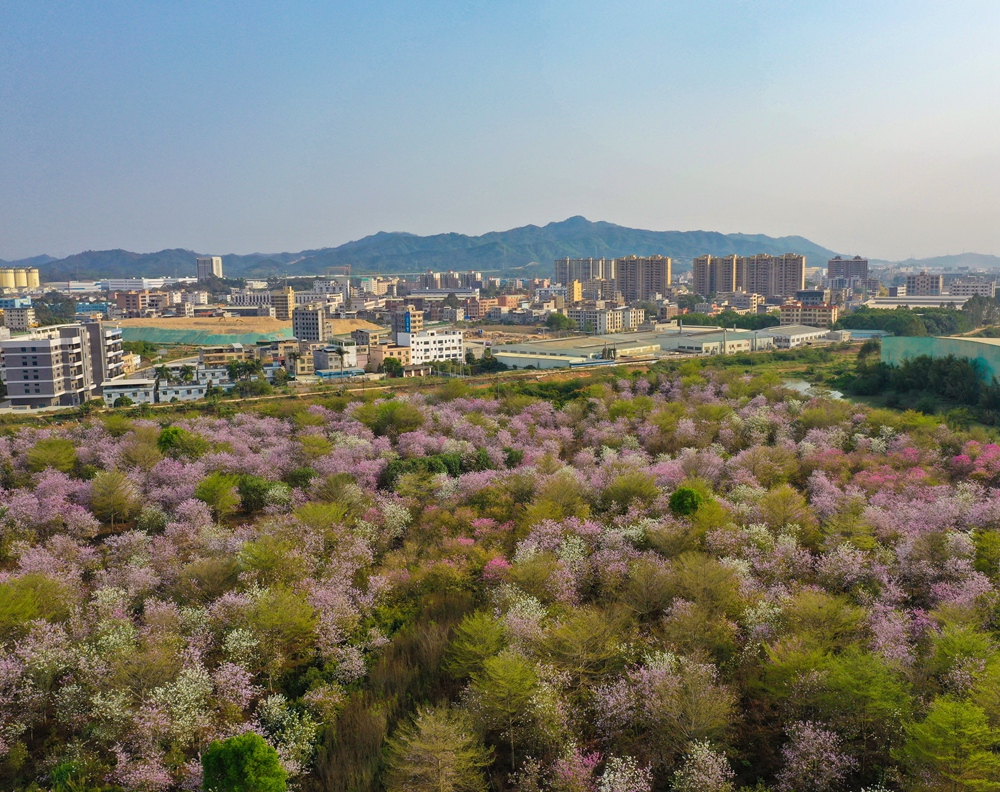 舉目望去,粉紅色的花海盛開在象頭山下、泰美鎮旁,構成了一幅鄉村振興的美麗畫卷。