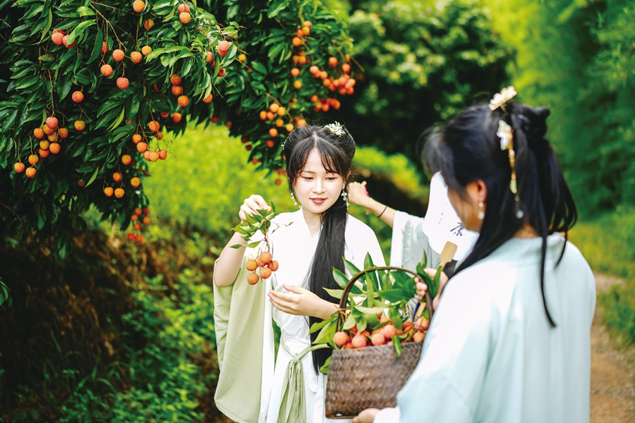 身著漢服的游客品嘗剛摘下的新鮮荔枝。