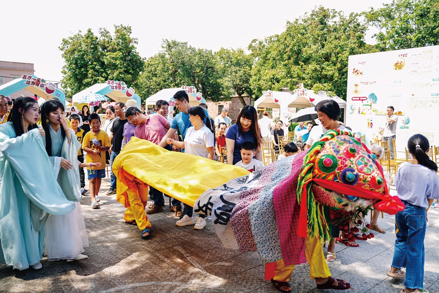 蘆洲鎮蘆村荔枝公園的百年古樹下人頭攢動,客家傳統麒麟舞伴隨著喧鬧的鑼鼓聲,歡快地在公園各處造勢舞動。現場還有創意十足的荔枝花束和特色茶飲,為古樹荔枝賦予全新的活力。以荔枝為主元素的活動吸引了一大批村民與游客駐足參與,獨具特色的八角方桌上擺放的蘆洲特色農產品讓人目不暇接。