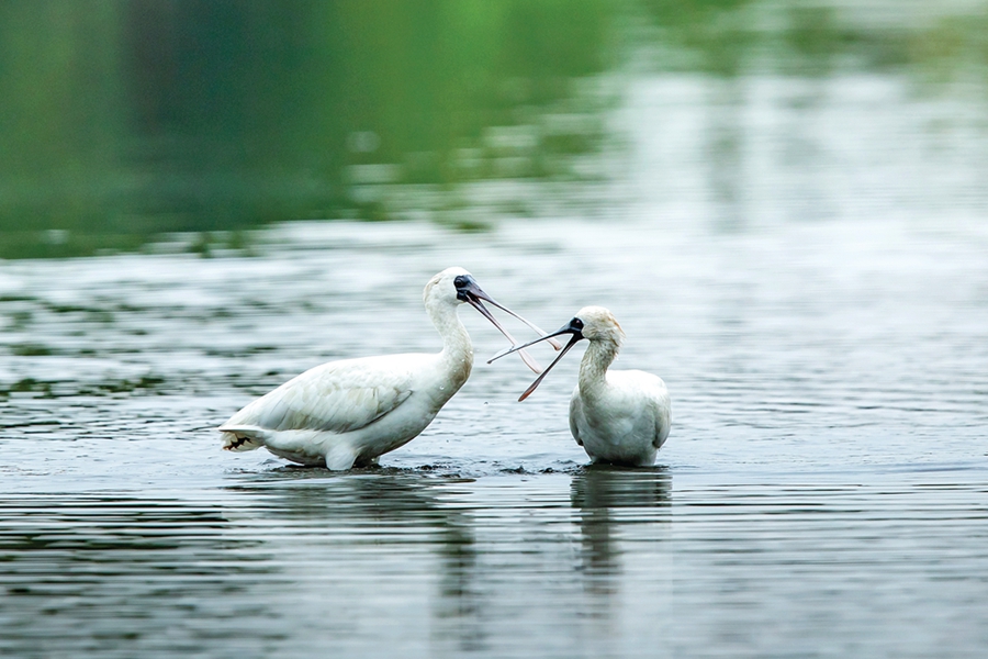 黑臉琵鷺是全球最瀕危的鳥類之一,也是國家一級重點保護野生動物,素有“鳥中大熊貓”之稱,因其扁平如湯匙狀的長嘴與中國樂器中的琵琶相似而得名。去年冬拍攝到的畫面中,約40只黑臉琵鷺呈一字隊形排開,與200多只長腳反嘴鷸結隊向前推進,20多只琵嘴鴨和大中小白鷺、灰鷺穿插群中,各種候鳥、留鳥“歡聚一塘”,共享水塘中的“饕餮盛宴”。