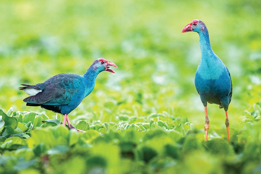 紫水雞是一種極其珍貴的大型水鳥,被譽為“世界上最美麗的水鳥”,其身上除尾下覆羽為白色外,其余羽毛均為藍紫色,腳暗紅色。紫水雞是留鳥,活動于海拔1900米以下的流速較緩或平靜、多植被覆蓋的開闊水面和富營養化的濕地。該物種主要分布于非洲、亞洲南部和大洋洲,在我國僅罕見于西南部地區,屬世界級瀕危鳥類,19世紀后在世界各地都非常罕見。