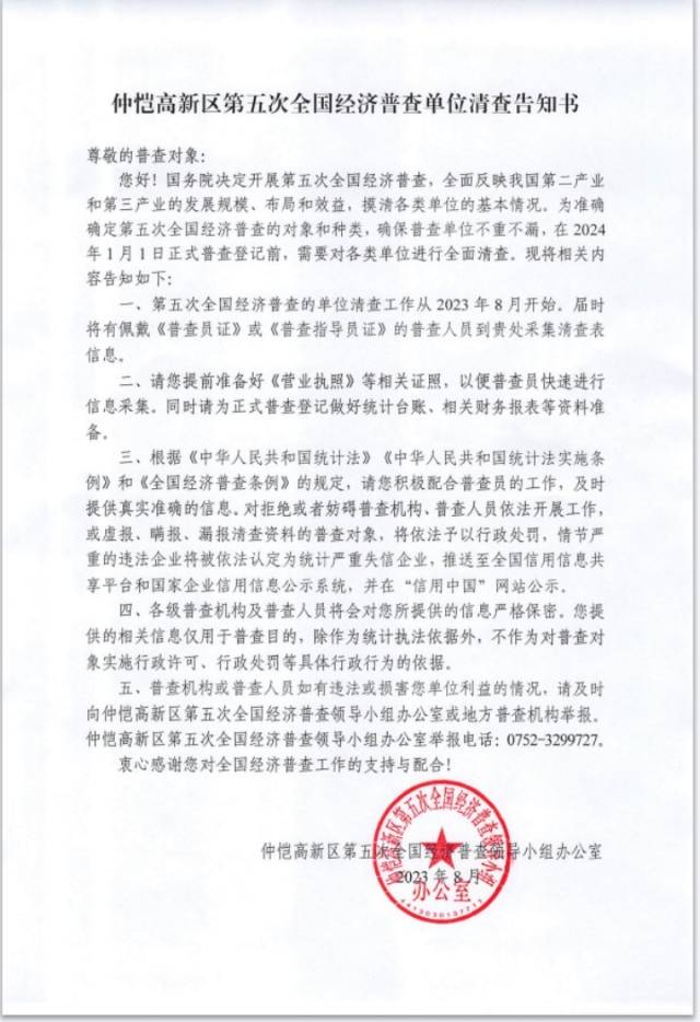 8月18日,仲愷高新區第五次全國經濟普查領導小組辦公室發布公告,提醒轄區群眾警惕以經濟普查為由的詐騙。