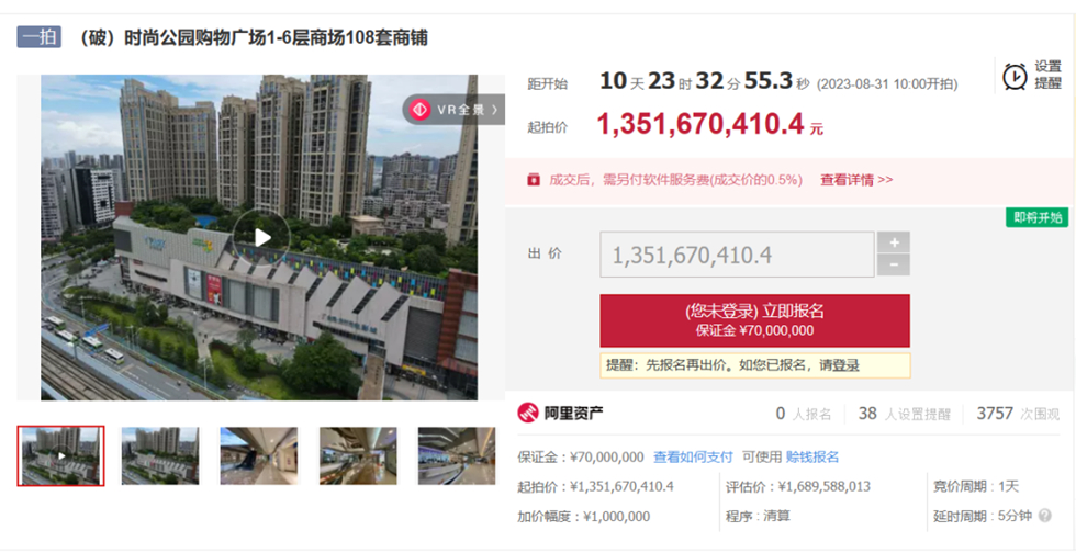近日,阿里資產(chǎn)平臺發(fā)布了《(破)惠州仲愷創(chuàng)業(yè)廣場發(fā)展有限公司管理人關(guān)于時尚公園購物廣場1—6層商場4層06號的破產(chǎn)拍賣公告》和《時尚公園購物廣場1~6層商場108套商鋪》拍賣信息,起拍總價約13.5億元,將在2023年8月31號進(jìn)行網(wǎng)拍,引發(fā)市民關(guān)注!