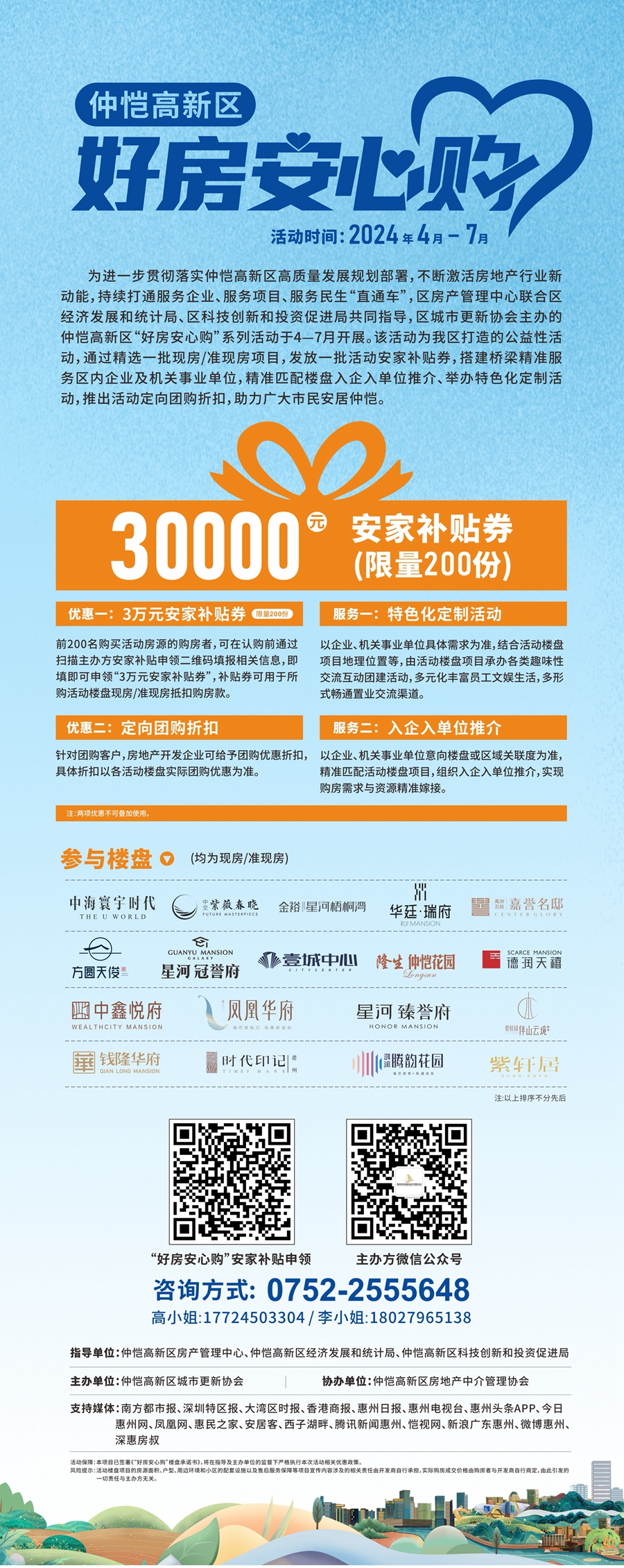 此次活動由仲愷高新區房產管理中心聯合仲愷高新區經濟發展和統計局、仲愷高新區科技創新和投資促進局共同指導,仲愷高新區城市更新協會主辦。活動時間從4月持續至7月,旨在落實仲愷高新區高質量發展規劃部署,助力廣大市民安居仲愷。