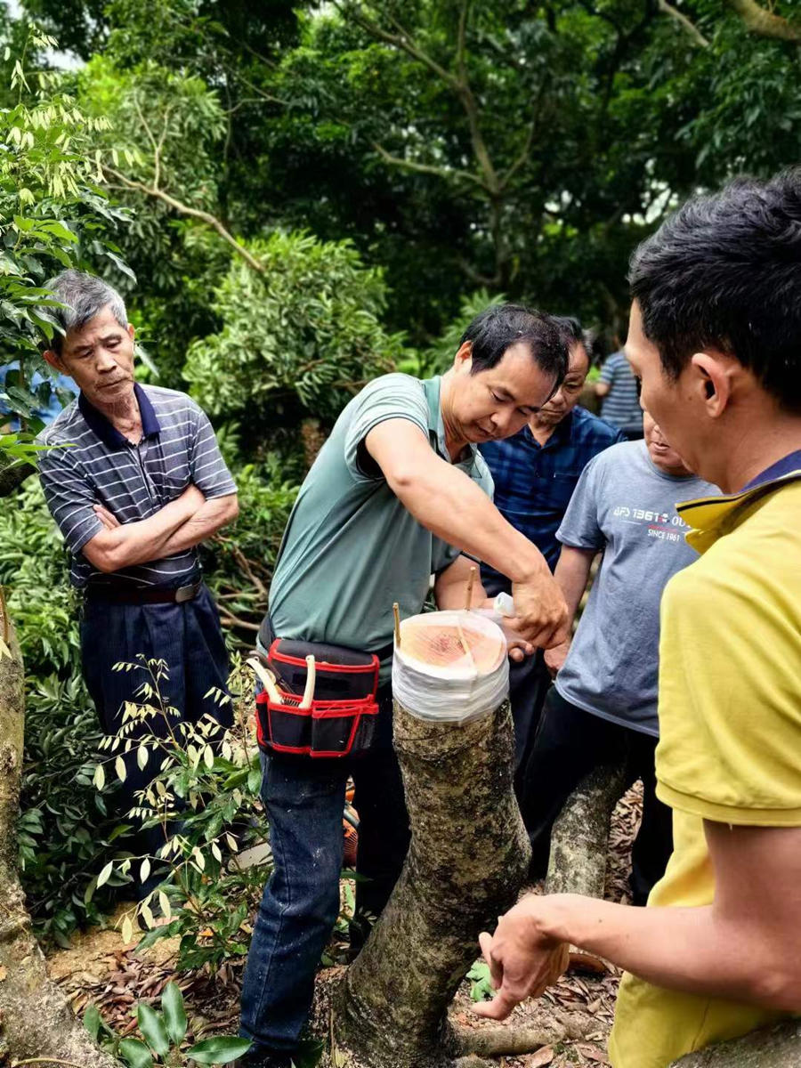 瀝林邀請專家為荔枝種植戶培訓(xùn)高接換種技術(shù)。 惠州日報(bào)記者邱舒婷 通訊員許皓然 攝