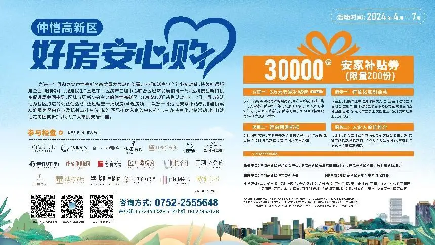 同時,為滿足廣大市民剛性及改善性住房需求,減輕購房壓力,仲愷高新區“好房安心購”系列活動嚴格執行相關優惠政策。“3萬元購房補貼券”正在持續發放,團購優惠折扣也在有序洽談,19個“五證”齊全的現房(準現房)樓盤項目均以最大的誠意,盡最大的努力,為廣大市民在仲愷安居送出最多的福利,提供最優的便利。此外,“好房安心購”的活動優惠還可疊加使用惠州市發放的“1億元樓市消費券”,補貼升級,更享實惠。