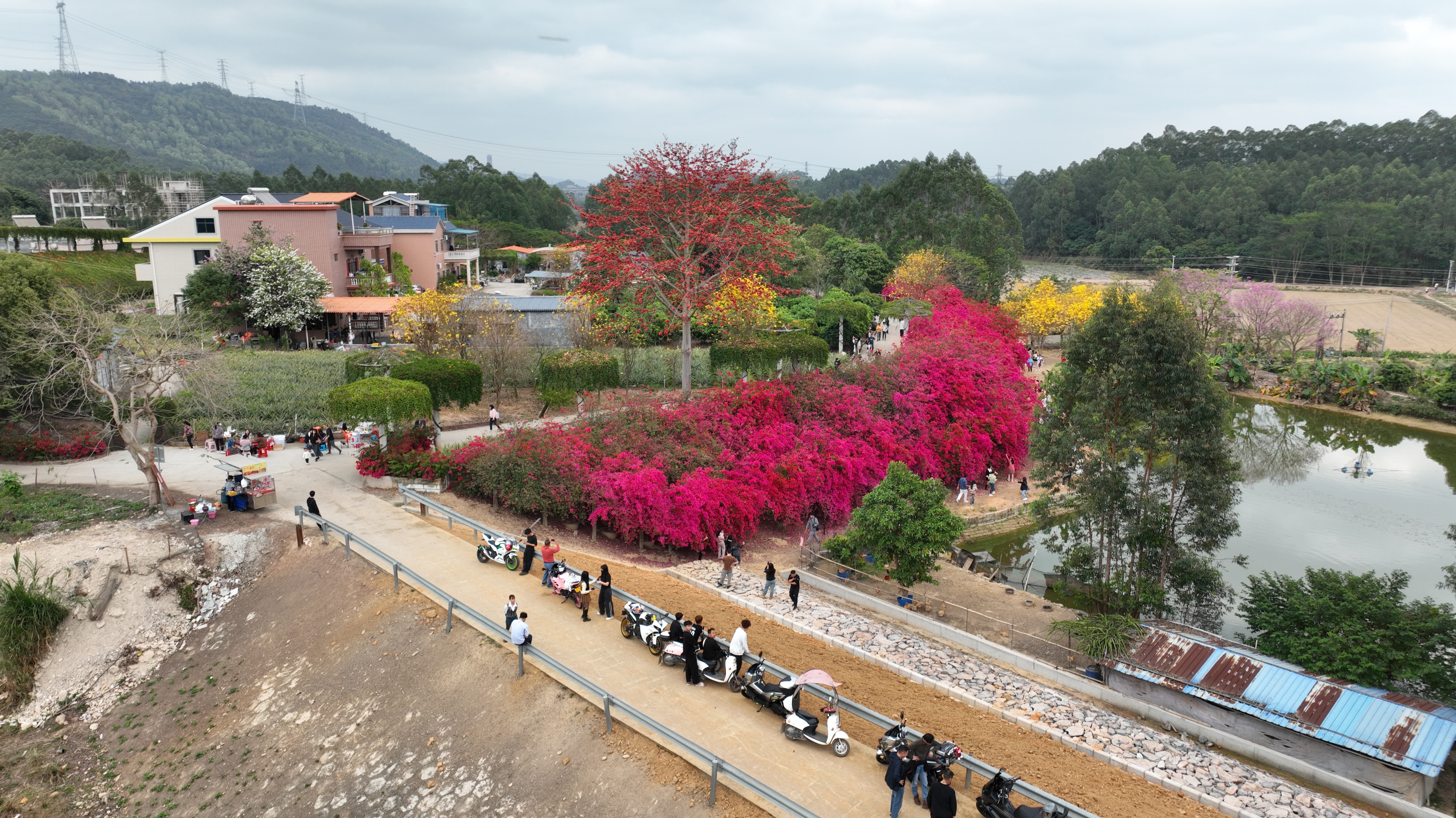 黃玉蘭家庭是潼湖鎮黃屋村一戶再普通不過的農村家庭,但今年春節過后,朋友拍攝的一段視頻將這個普通家庭送上“熱搜”。面對突如其來的走紅,黃玉蘭家庭商量決定免費開放自家庭院,供游客欣賞“三角梅瀑布”。不僅如此,他們還提供免費茶水、洗手間等服務,并自發平整出一個面積約10畝的臨時停車場供游客使用。