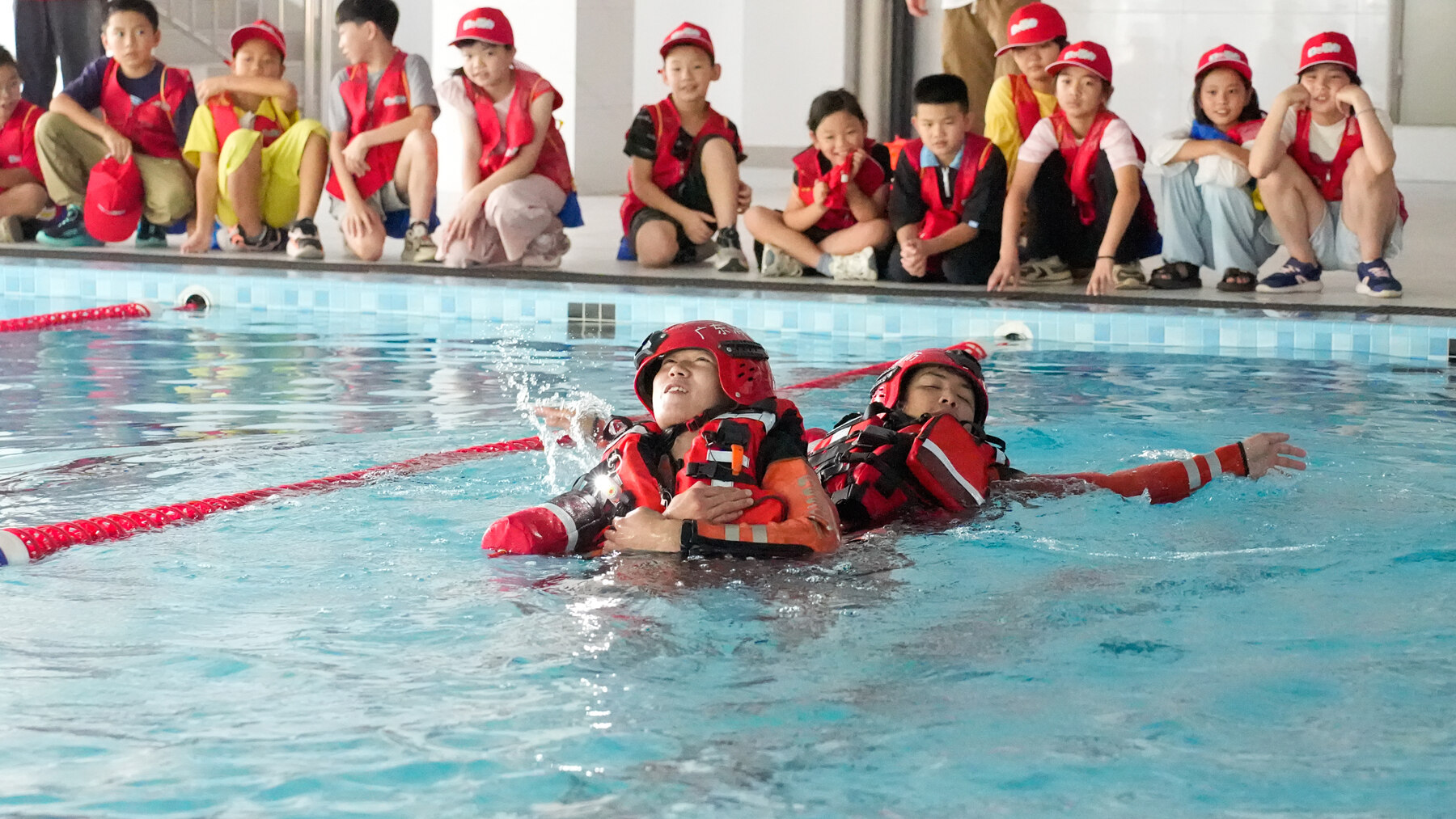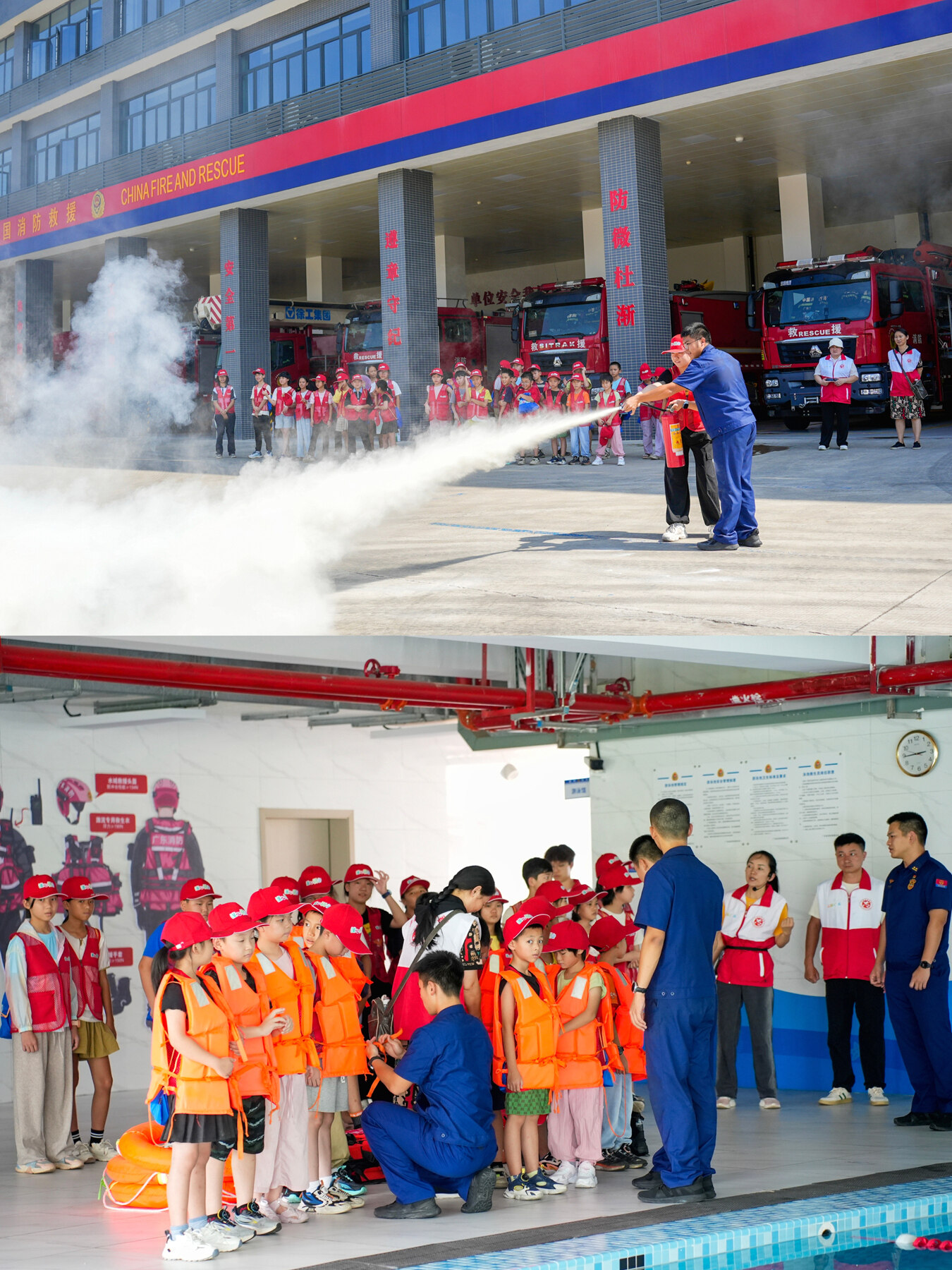 下午,孩子們走進中韓(惠州)產業園起步區中區消防站,開啟了一場干貨滿滿的安全知識探索之旅。消防員化身安全守護者,現場演示并指導孩子們練習救生衣正確穿戴、水上施救姿勢和救生圈拋投技巧,提升孩子們的自我保護能力。隨后,孩子們近距離接觸消防車,了解其結構與功能,并在消防員的指導下學習滅火器操作要點(“一拔、二握、三壓”),親身體驗滅火器和消防水槍操作。在云梯攀爬救援模擬場景中,孩子們看得全神貫注,為消防員的專業和勇敢點贊。活動尾聲,通過觀看防溺水、防火安全教育短片,孩子們進一步提高了安全防護意識。