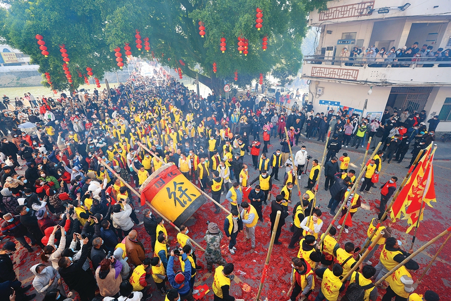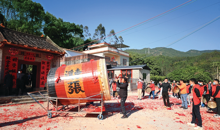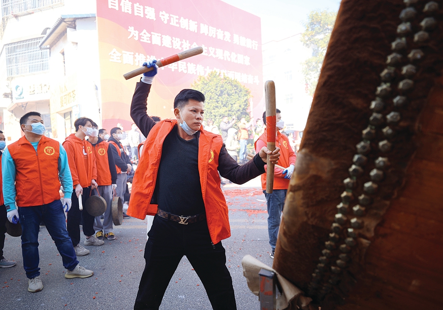 “咚,咚咚,咚咚咚……”1月29日,農(nóng)歷正月初八,時(shí)值博羅縣橫河鎮(zhèn)大部分村莊的“上燈”之日,傳承500余年的橫河大鼓也如約在圩鎮(zhèn)擂響。聲遏云霄的鼓聲,承載了鄉(xiāng)親們對(duì)國泰民安的美好祈愿,也成為當(dāng)?shù)卮迕駡F(tuán)結(jié)和睦的真實(shí)寫照。