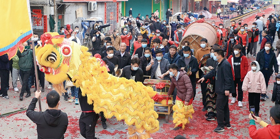 “接燈”的隊伍敲著鑼鼓,舞著獅子,放著鞭炮。