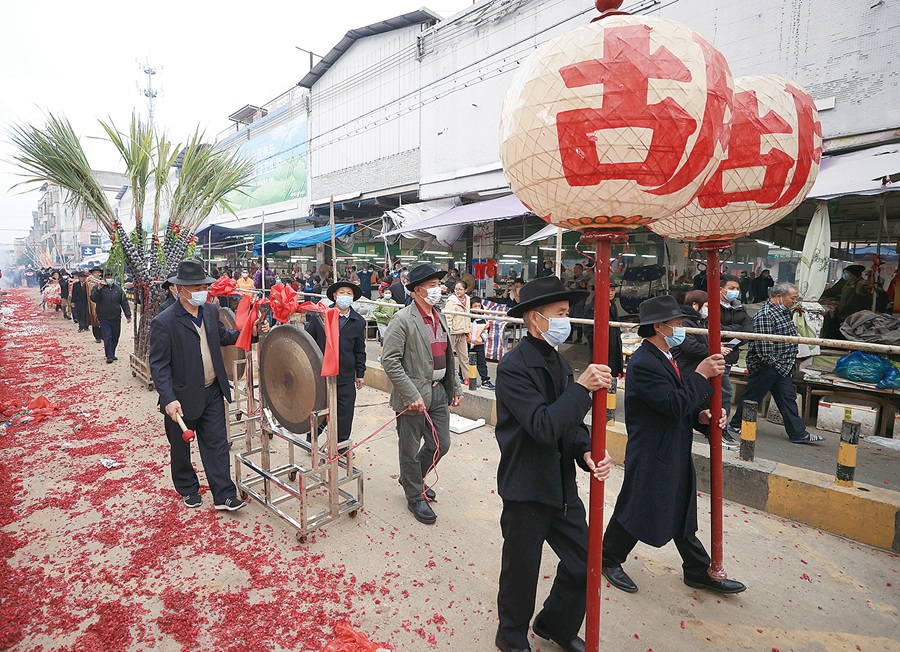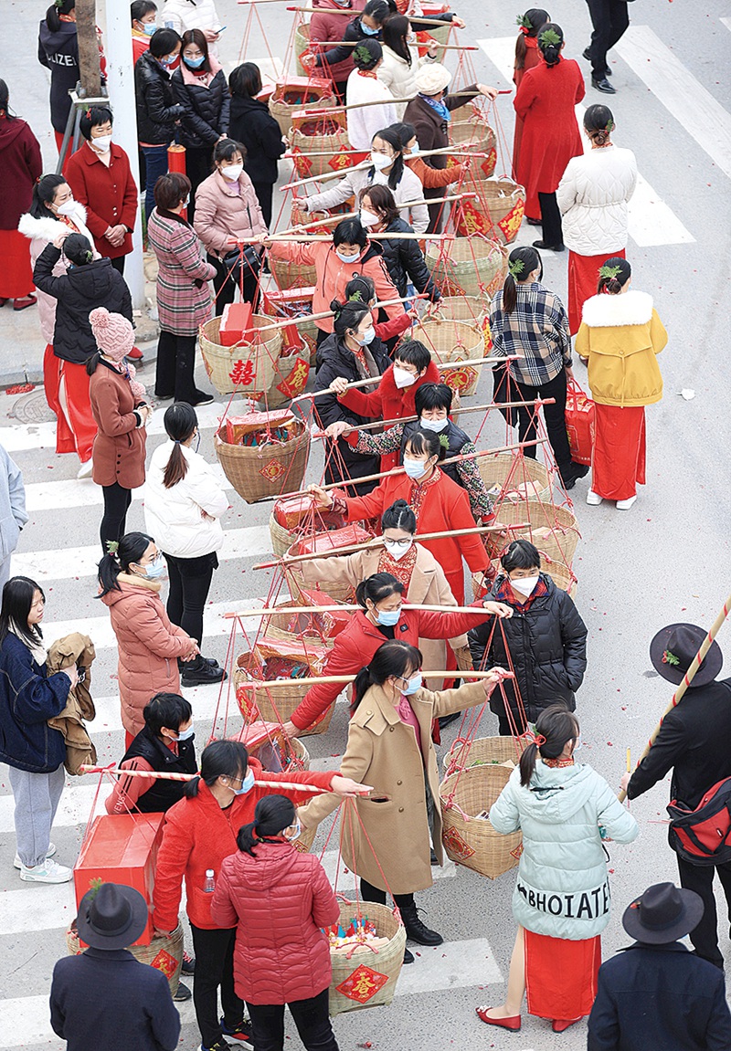 記者在現場看到,當天,當年添丁的媳婦挑著籮筐跟隨在隊伍中去上燈,婆婆和妯娌也加入到了其中,裝有物品的籮筐有些重,婆婆、妯娌為媳婦分擔一路的勞累,相互接力,互換著挑起籮筐,也接力挑起了家庭的擔子,體現出濃濃的婆媳、妯娌和睦持家的情義。沿途各姓氏上燈、巡游的隊伍在街頭相逢,還會相互問候祝福。