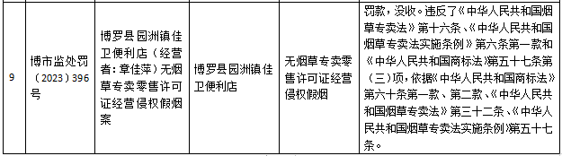 而博羅縣龍溪錦秀程百貨商行、博羅縣龍溪言本茶煙酒商行、博羅縣石灣鎮零壹便利店、博羅縣楊村鎮都好生活超市、博羅縣園洲鎮榅洋便利店、博羅縣園洲鎮佳衛便利店等6家便利店和商行的違規行為均集中于無煙草專賣零售許可證經營卷煙侵權行為,且部分商行還被查出銷售侵權煙草和經營侵權假煙等行為,均被市場監管部門依法予以罰款和沒收違法所得。
