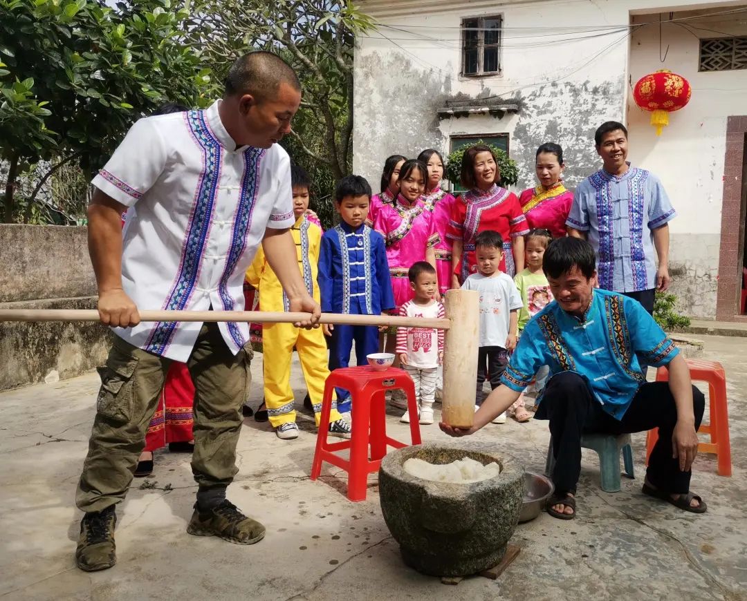 畬族人逢年過節都會打糍粑。打糍粑一般需要兩個人,一個人打,一個人翻,打糍粑的人要很有力,打一會還要換人。身強力壯的年輕小伙拿著杵棰捶打石臼里的糯米飯,村里人都會匯集在一起觀看打糍粑并唱歌助興,打好了大家就一起品嘗新鮮出爐的糍粑。以前過年,畬族每家每戶都要打上幾十或上百個糍粑,將晾干的糍粑放進缸里用冷水浸泡,期間換幾次水,這樣糍粑就可以保存到過完年的三、四月份。