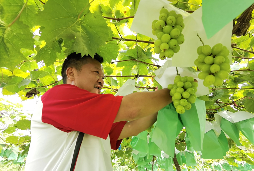 而今,在葡萄園里,一串串陽光玫瑰葡萄懸掛在葡萄藤上,在陽光的照射下,猶如翡翠般通透,讓人垂涎欲滴。摘一顆放入嘴里,清甜多汁、果香肉脆,淡淡的玫瑰香味充滿整個口腔,迅速征服了舌尖上的味蕾。技術人員介紹,除了這里的山水滋養外,有機的種植方式,也讓這里的陽光玫瑰葡萄品質更優。